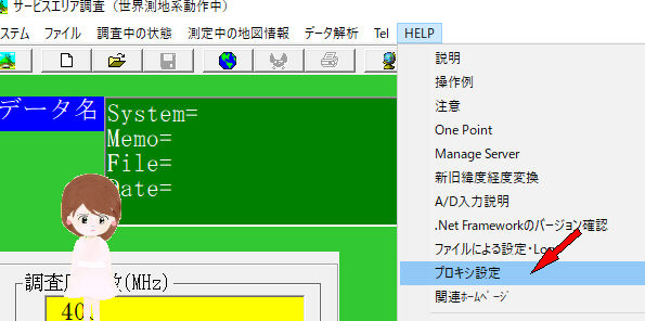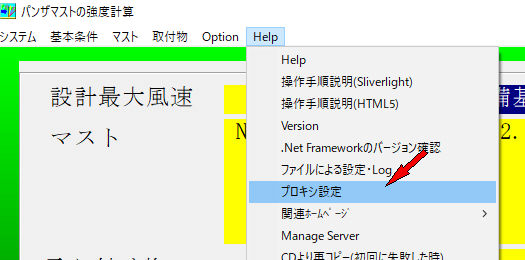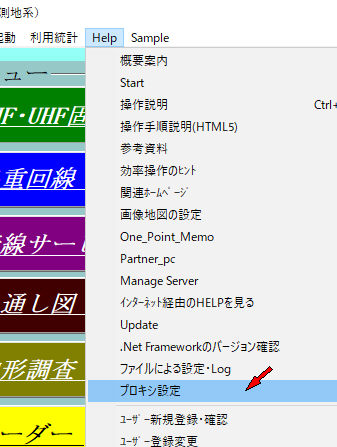 最初の画面のHelp->プロキシ設定をクリック。(回線設計・エリア調査・パンザマスト強度計算・混信調査・実験報告)