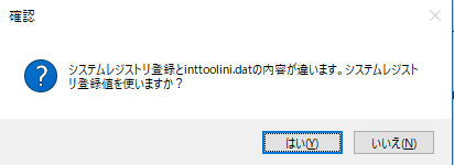 設定情報はintoolini.datより読み込みますが、プロキシのシステムレジストリ登録が有効な時、システムレジストリ登録を使うかの確認が出ます。