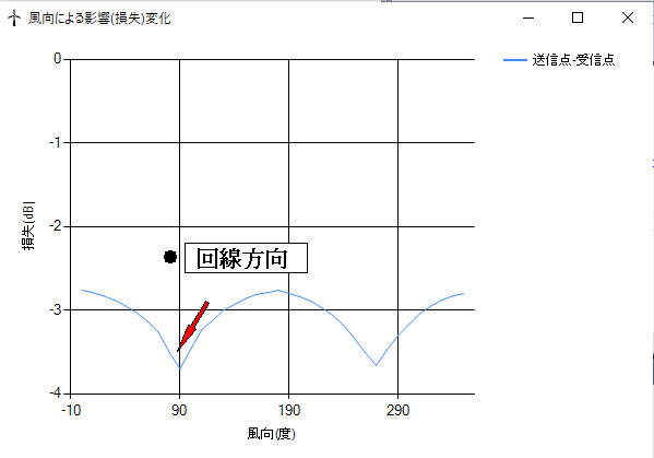 -1.風向きと回線方が一致したところで損失が最大となっている、又風向きが反対方向でも損失が最大となっている。