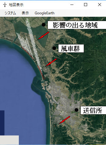 秋田のテレビ放送への影響例(位置は地図より風車サイズは推定)