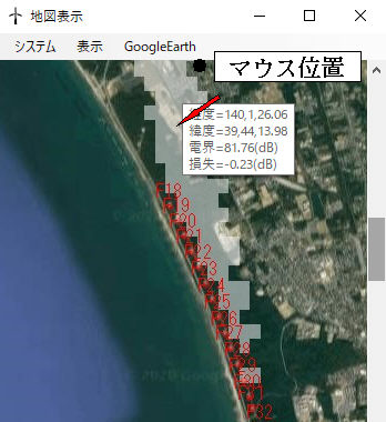 b.データ表示 マウスの移動で緯度経度と電界値・損失値を表示します。