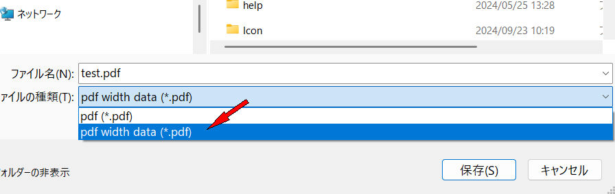 b.出力先の種類でPDF width data *.pdfを選択。