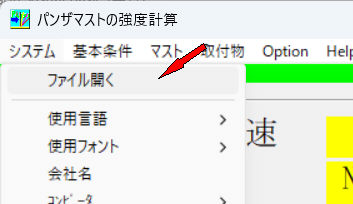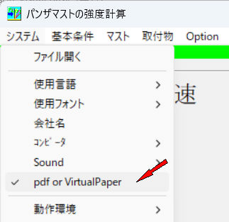 パンザマスト強度計算最初の画面でプルダウンメニューのシステム->PDF or Virtualpaperにチェック