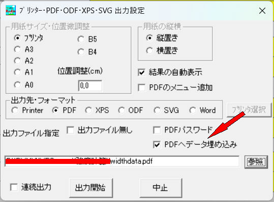 これにより、結果のPDF出力は普通に行えるが、計算条件などのデータもPDFに埋め込まれます。
