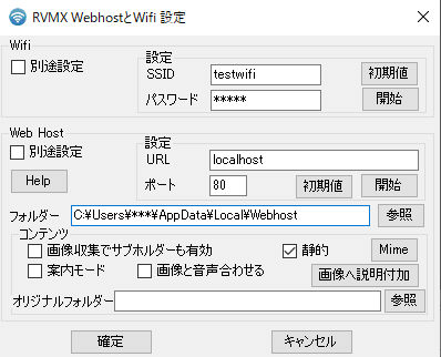 ・開始ボタン Myweb(PC内に簡易的に作成するWeb環境(簡易サーバーとWifi))を動作させます。