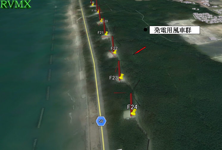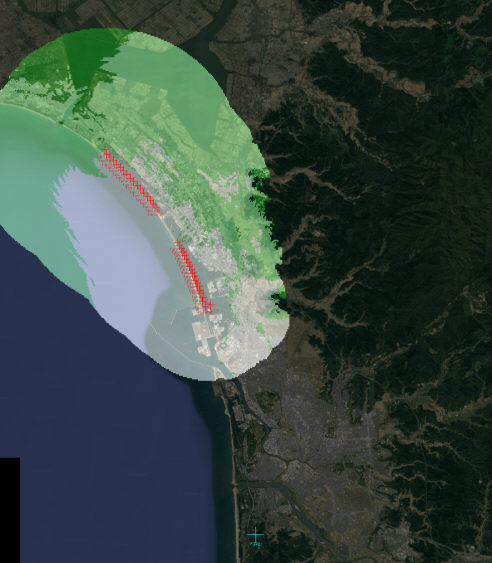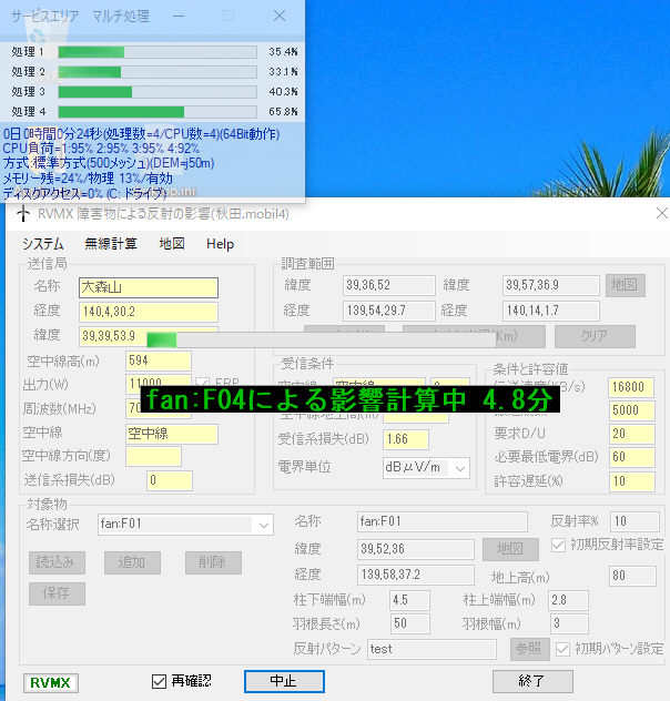 発電用風車は37台設定し、計算時間はメッシュ数500(見通図+無線回線計算数=925万回)で約1時間(4コアCPUにて)でした。