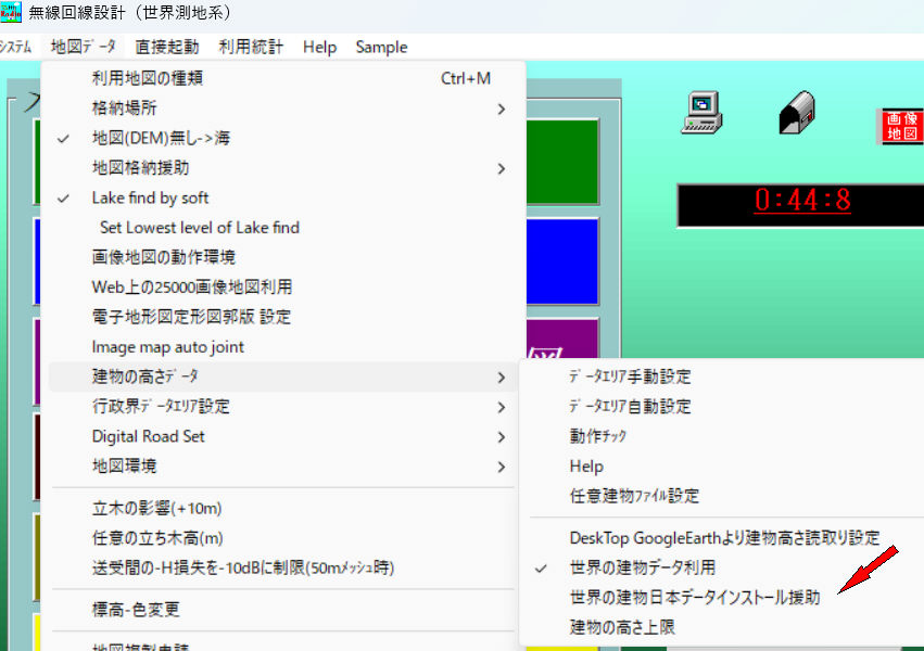 a.回線設計の最初の画面より、地図データ->建物の高さデータ->世界建物日本データインストール援助をクリック