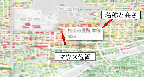 -2-3-1.背景地図は白黒で建物は色がついています、マウスを目的の建物へもっと行くと高さが表示されます。