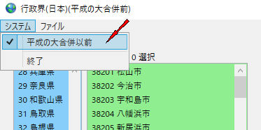 -2.プルダウンメニューのシステム->平成の大合併以前をチェック行政界より利用します。