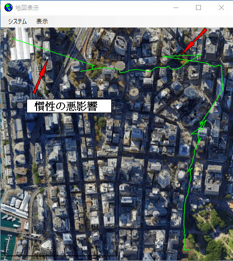 b-3.慣性 GPS信号が受信できない時、事前の速度と方向より予測(シドニーのビル街での検証結果、ON/OFF可能としました)