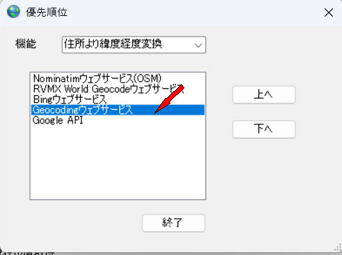 海外の住所より緯度経度を取得するときは、Geocodingウエブサービスの優先順位を下げておいてください