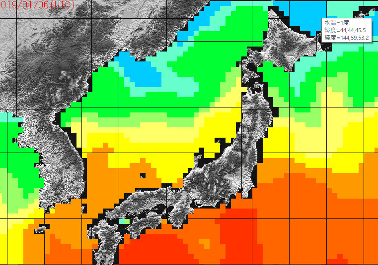 マウスを水面に移動すると、そこの水温と緯度経度が表示されます。