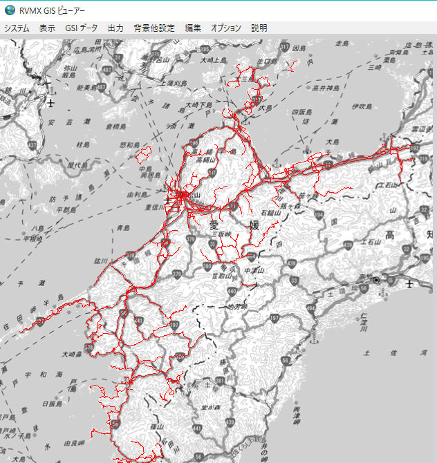 愛媛県のバス路線を線路を赤色で作図した例。