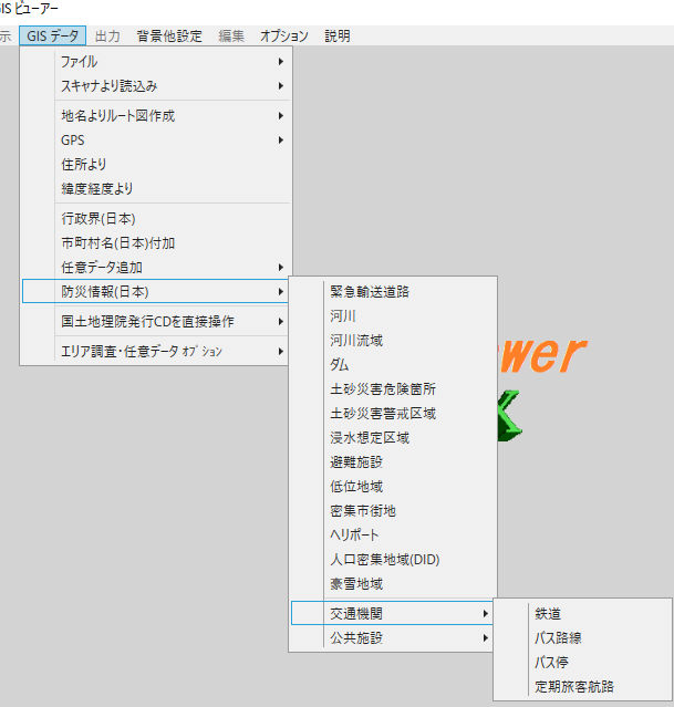 -3.目的の地図を表示後、GISデータ->防災情報(日本)->交通機関->バス停をクリック