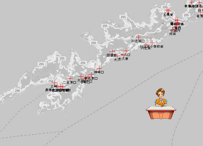 愛媛県興居島のバス停を+マークと名称(黒色)で作図した例。