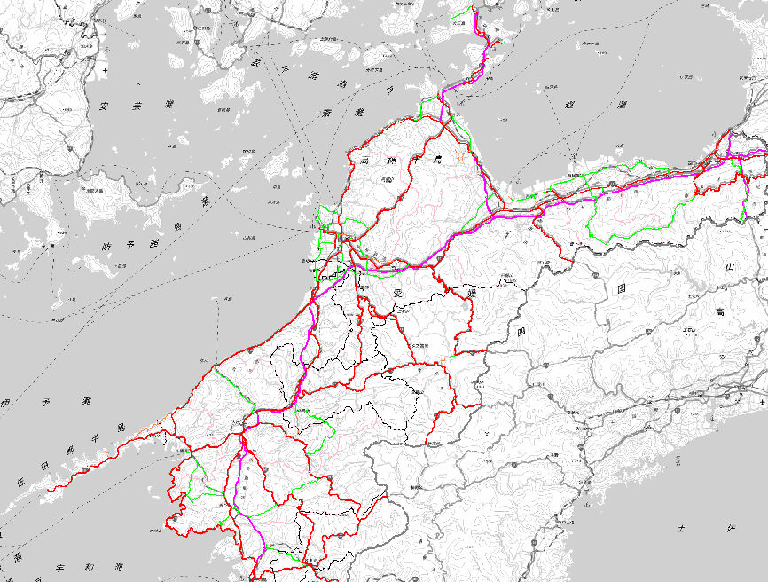 愛媛県に高速道路はピンク・国道は赤・県道は緑で作図した例。