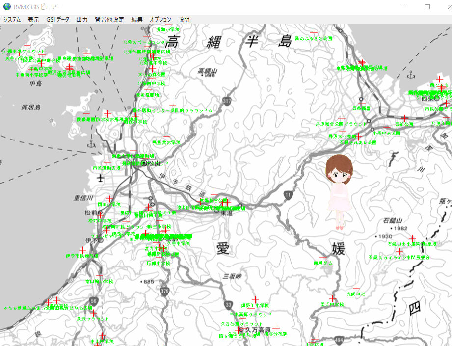 松山市周辺のヘリポートを+マークと名称(緑色)で作図した例。