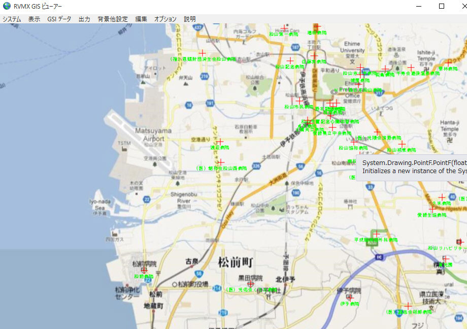 松山市周辺の医療機関を+マークと名称(緑色)で作図した例。