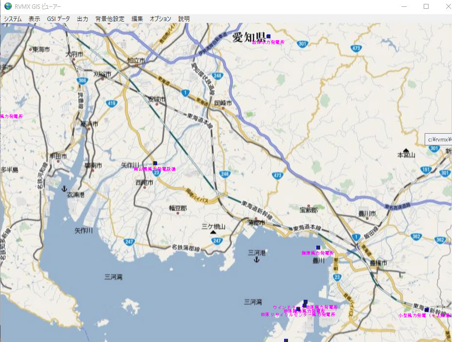 三河湾周辺の発電所を四角マークと名称(ピンク)で作図した例。