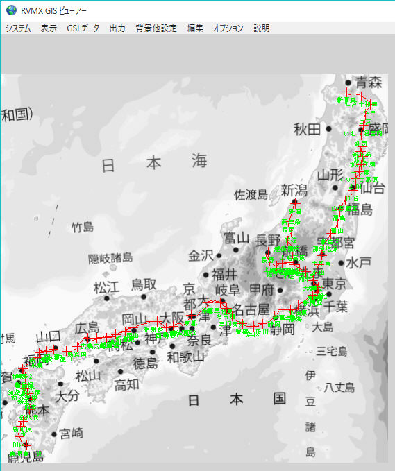全国の新幹線を線路を赤色・駅を十字マーク・駅名を緑色で作図した例。