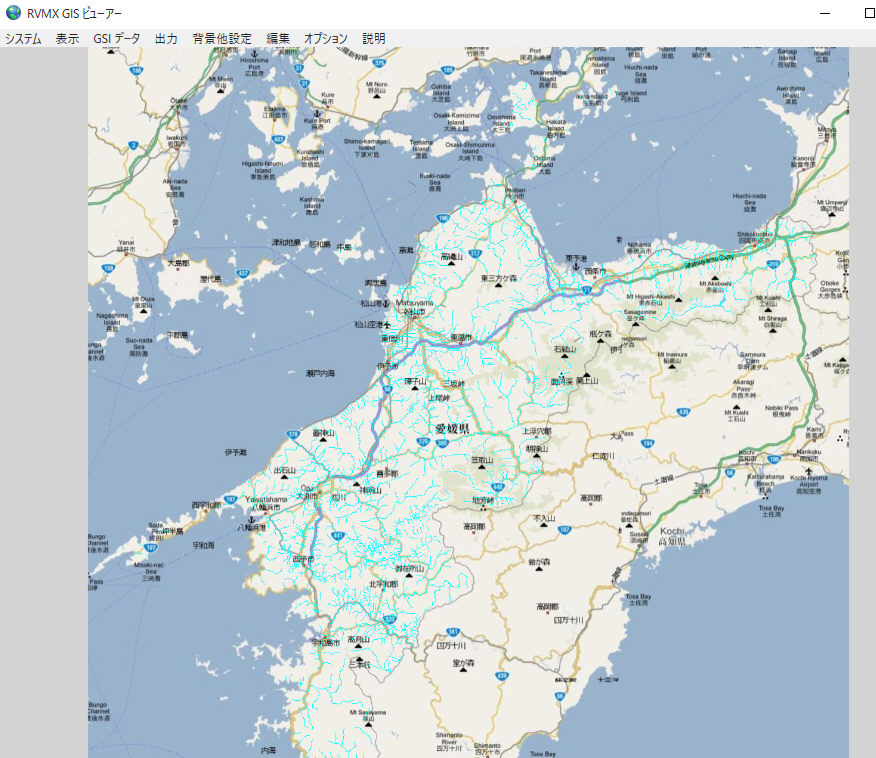愛媛県全ての河川を水色・線幅1で作図した例。