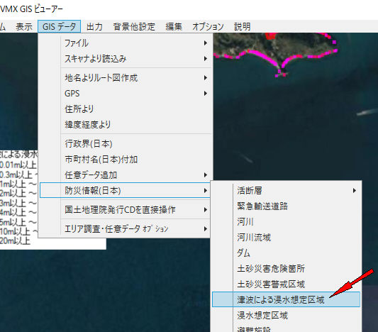-3.目的の地図を表示後、GISデータ->防災情報(日本)->津波による浸水想定区域をクリック