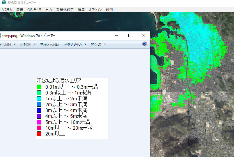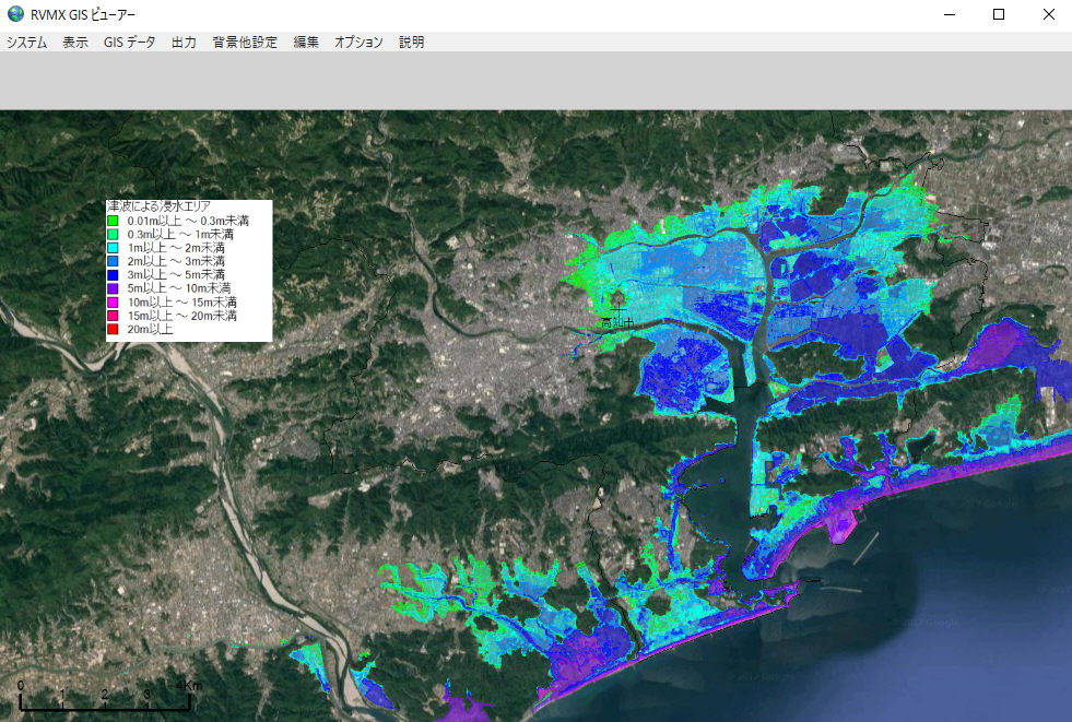 RVMX GIS Viewerで国土交通省が提供している津波による浸水想定区域データを作図する機能です。