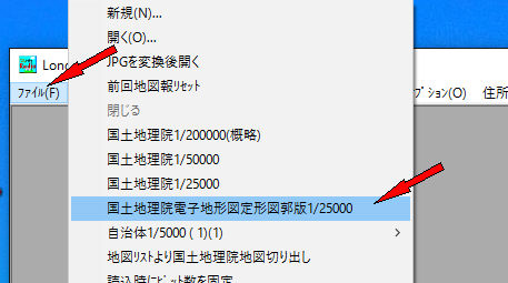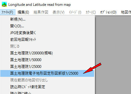 地図画像の画面よりファイル->国土地理院電子地形図定形図郭版1/25000をクリック