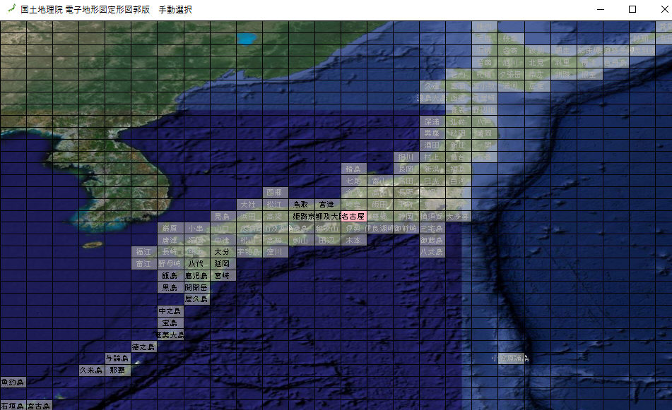 旧25000のデータより2次メッシュ名を薄く表示します。但し、電子地形図定形図郭版では違ってきている可能性もあるので参考にしてください。