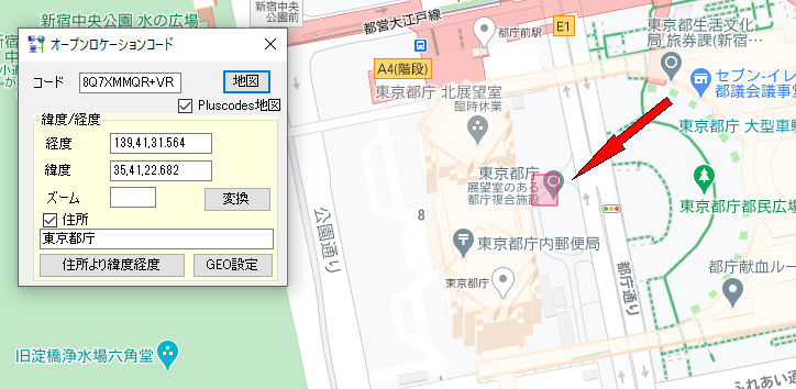 -1.東京都庁->緯度経度->Open Location Code->Pluscodes地図で表示例