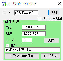 クラス単体では利用できないので、緯度経度や住所よりOpen Location Codeへ変換し地図表示行うソフトを作成し紹介しています。