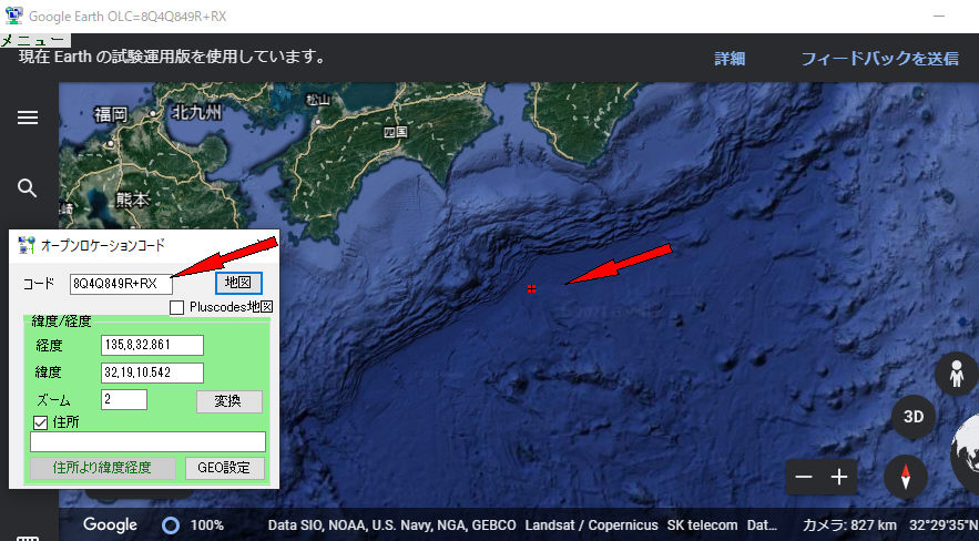 c.Edge(Chromium)による地図より緯度経度を取得する機能(評価機能)で確認 Pluscodes地図をチェックを外し、地図ボタンをON
