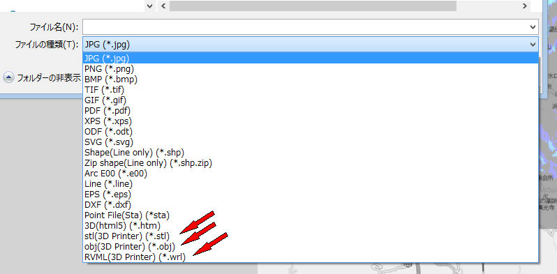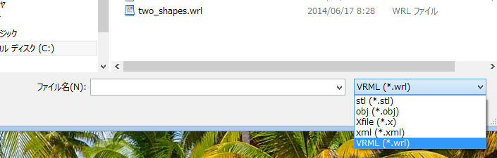 選択できるのは、STLとOBJ及びVRML(2014年は試用2015年より参考機能)ファイルです
