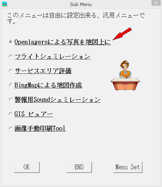 a.サブメニューよりOpenLayersにより写真を地図上へをクリック