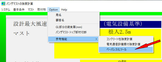 a.RVMXパンザマスト強度計算の画面より、オプション->参考機能->ペーパレス化ツールをクリック。