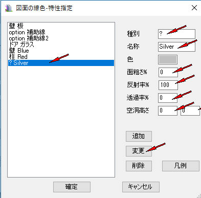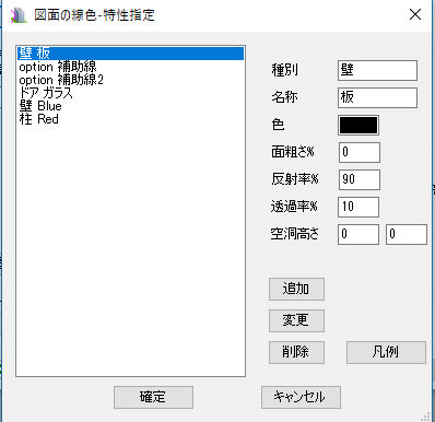 各壁の名称や種類・反射率%・透過率%・面の粗さ%・中空が有る時は上端の高さ及び下端の高さを指定