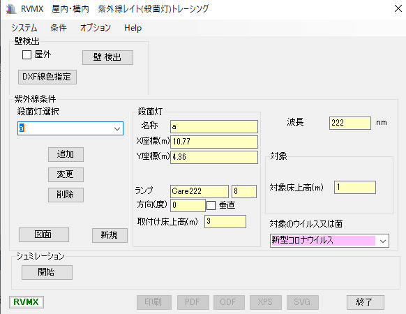 概要 RVMX 遠紫外線(222nm)による新型コロナ無効化シュミレーションβ版(参考)を無線レイトレーシングへ組込み。