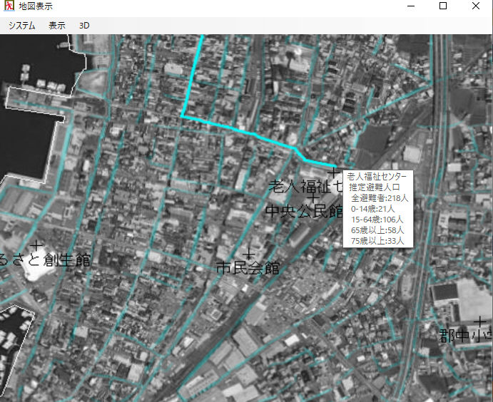 使われるデータは道路・河川・家・人口・避難場所・地形等を元にして避難ルートを推定しています。