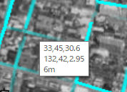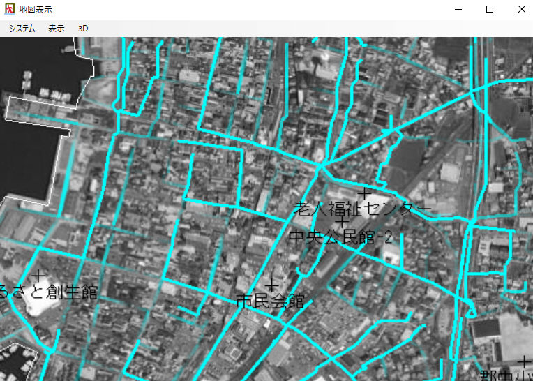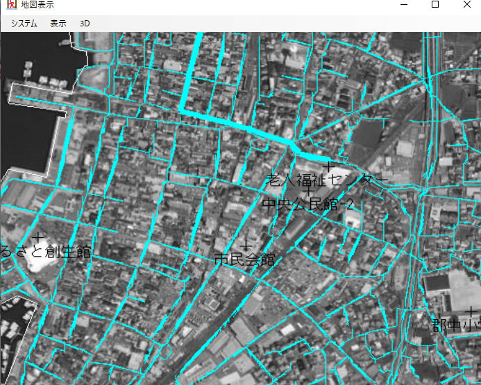 a.検出ボタン 指定範囲の人口/道路/河川/家/地形データを抽出します。