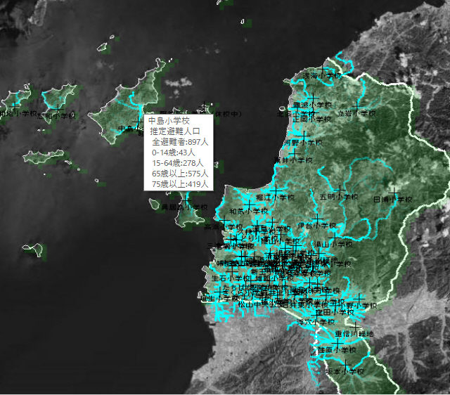伊予市役所より半径1Kmで各避難所への避難人口比率例