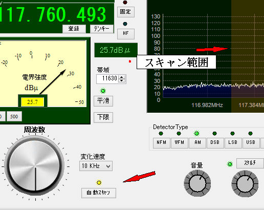 ・自動スキャン(追加) スペクトル表示範囲を自動スキャンし最大電界値に合わせます