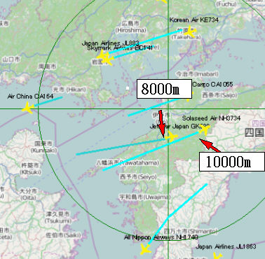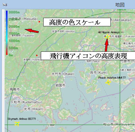 -7.航空機のアイコンの中心に高度を表現する色が付いています、各色の光度は地図の左上に有ります。但し、航路が表示状態では表示しません。