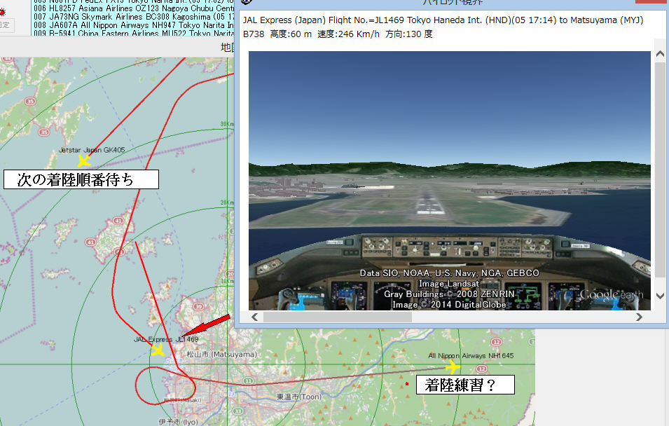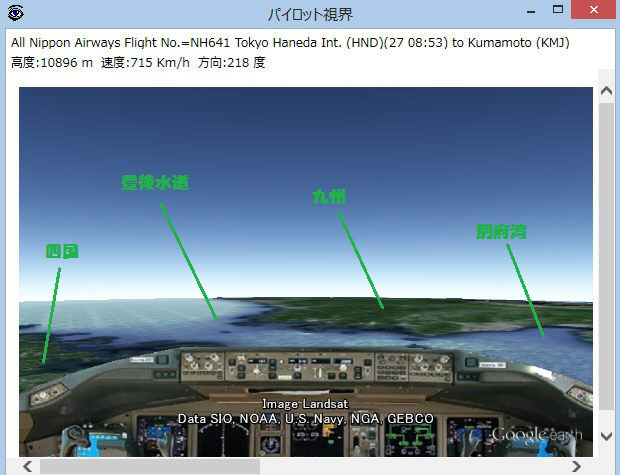 -5.航路を選択した状態でFキー又はF1を押すと、パイロット視点の画像が見えます。(但し、Google Earth pluginがインストールされている必要があります)