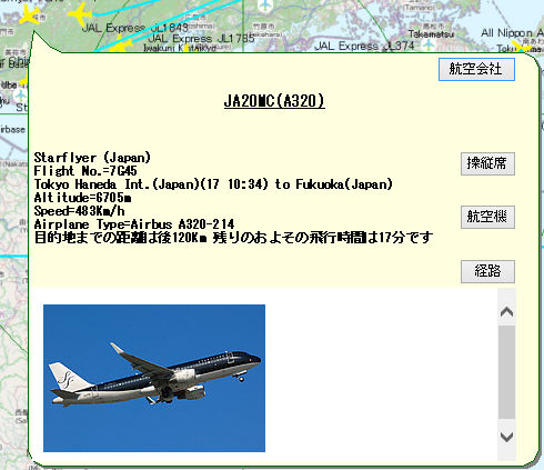 -2.航空機をマウスでクリックすると詳細情報が表示されます、また航路(ON/OFF)も表示されます。