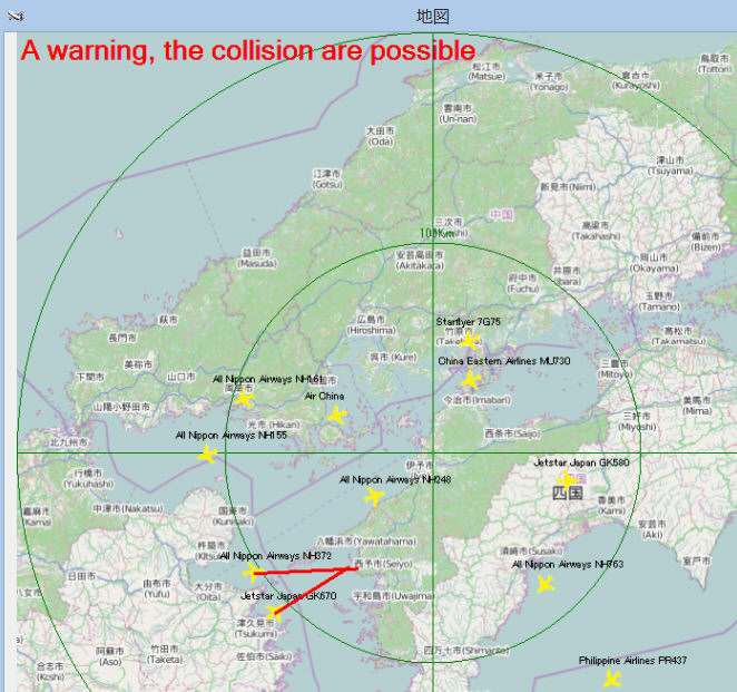-6.衝突検知距離を1000mとし、実際の監視をしていると本システムの警報が出て、数秒後に実際の航空機が針路を急変更しているのが確認できました。