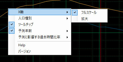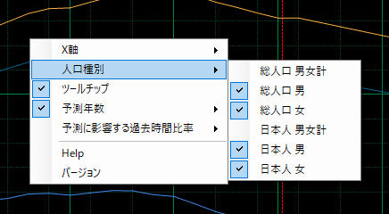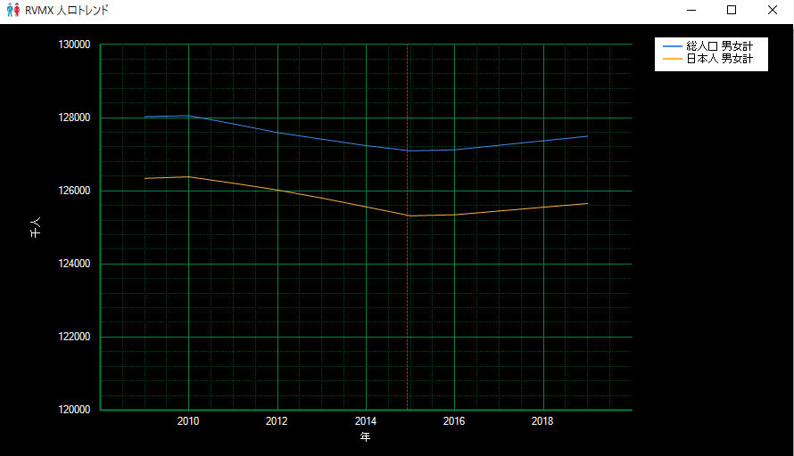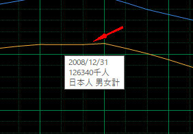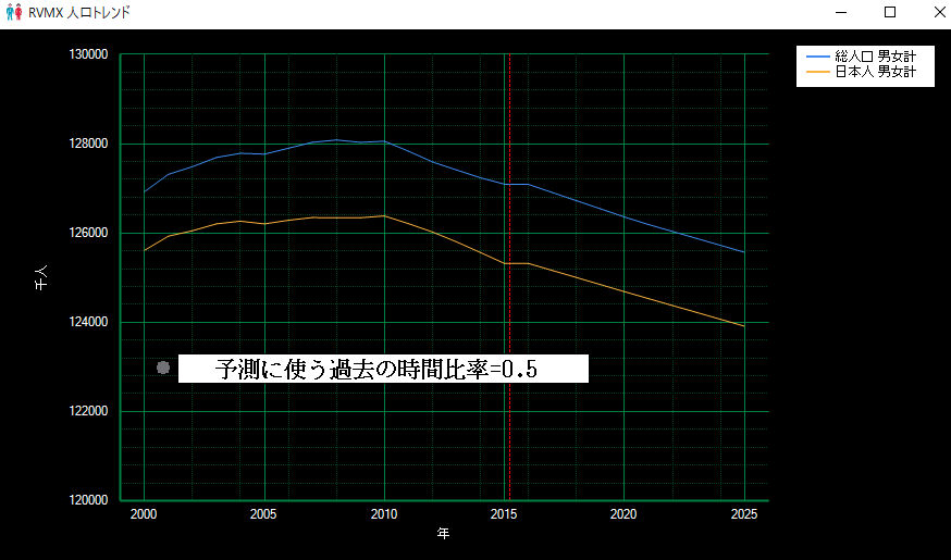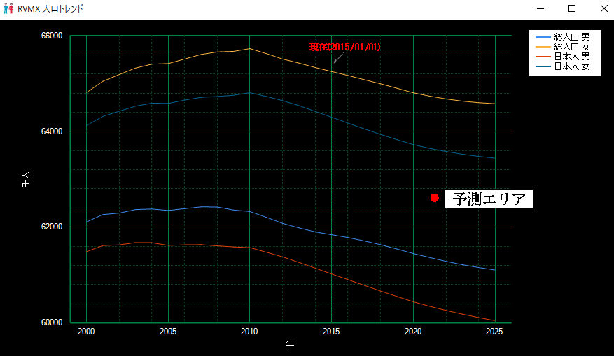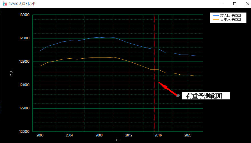 日本の人口チャートでRVMX AIによる将来値予測β版(参考)