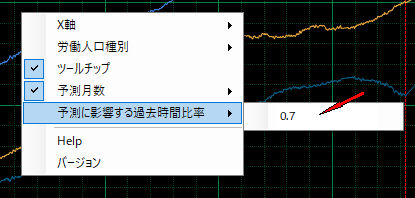 -5.予測に影響する過去時間比率 予測に影響する過去のデータの利用比率(1〜0)。1の時は全てのデータを利用、小さくなると最近のデータを利用。
