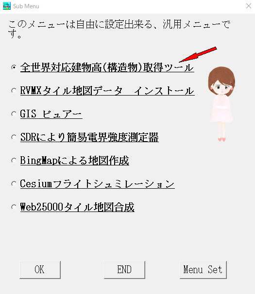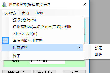登録したい場所を選択し、Menu Setボタンを押して、候補より全世界対応建物高(構造物)取得ツールを選択