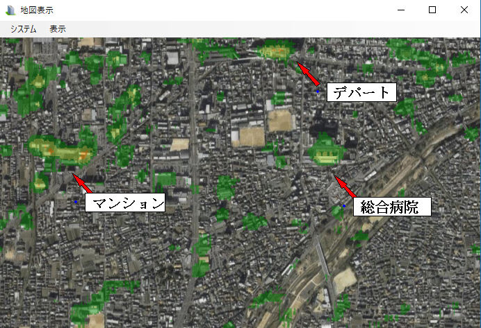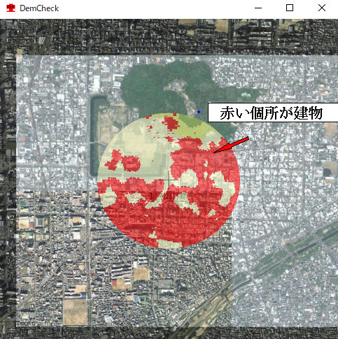 -2.衛星データ(1 Arcsec解像度の為)の為、比較的大きな建物のみの検出となっています。