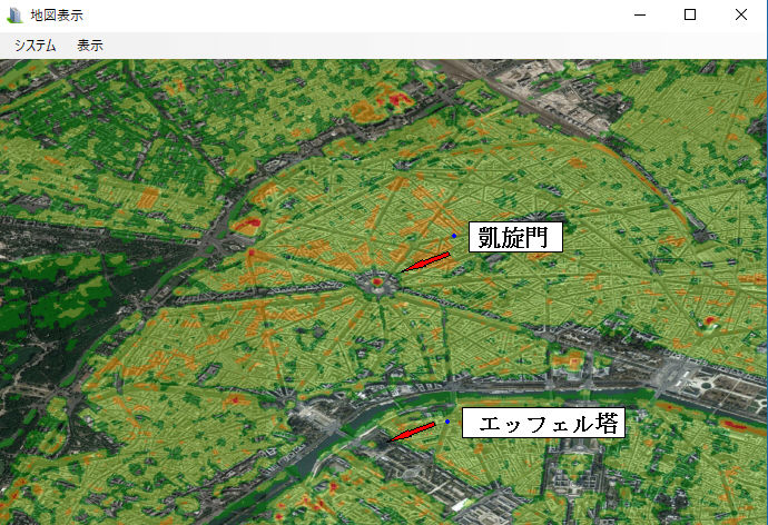 パリは建物の高さが制限(20m以下)されているため比較的同じような色に成って居ますが、凱旋門は赤で30m以上が分かります